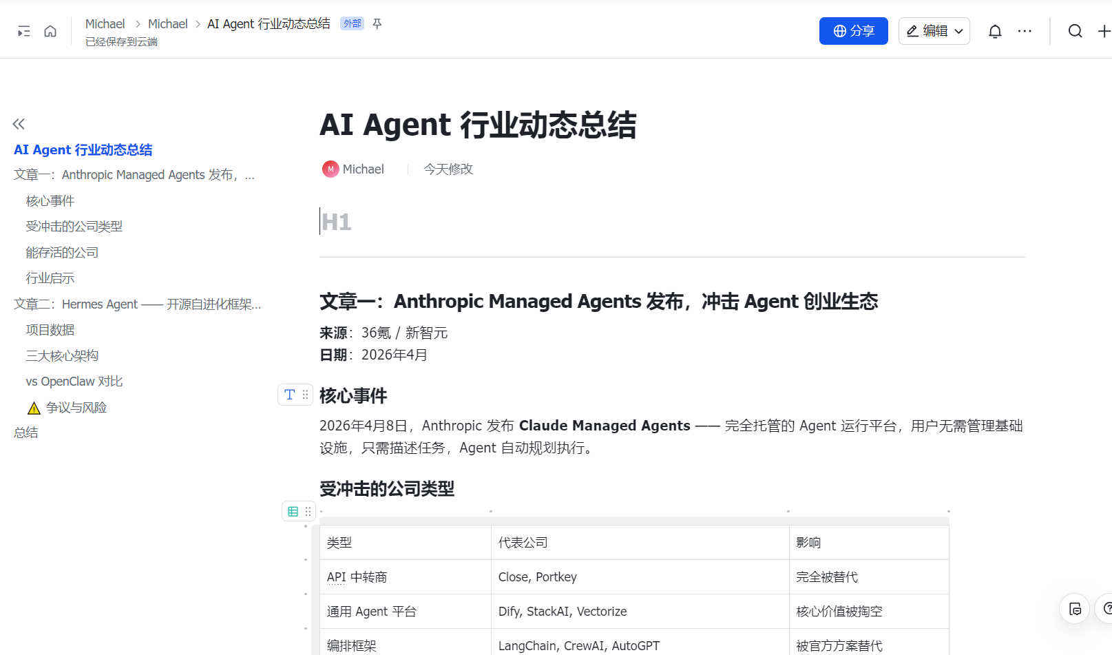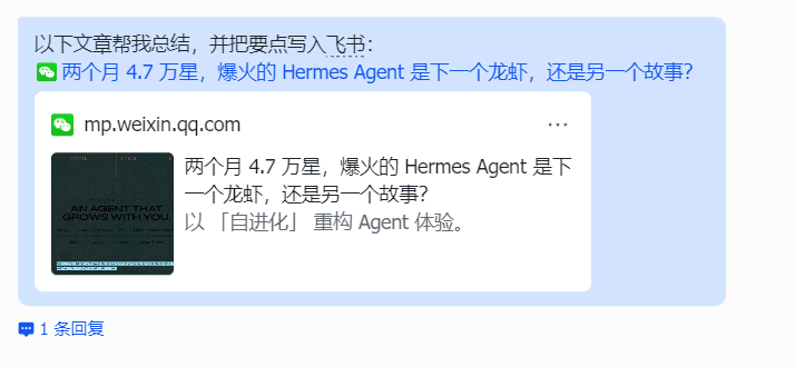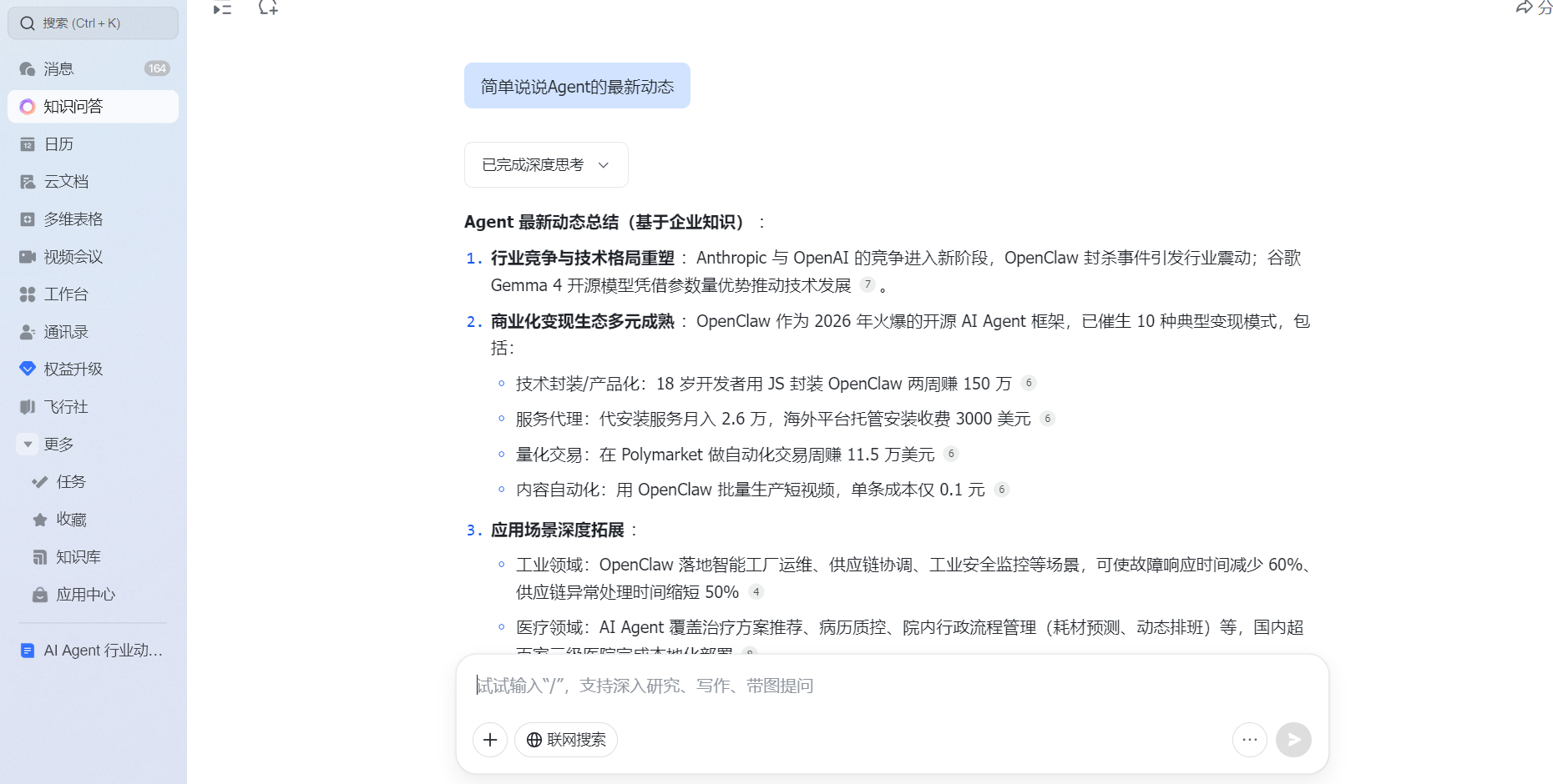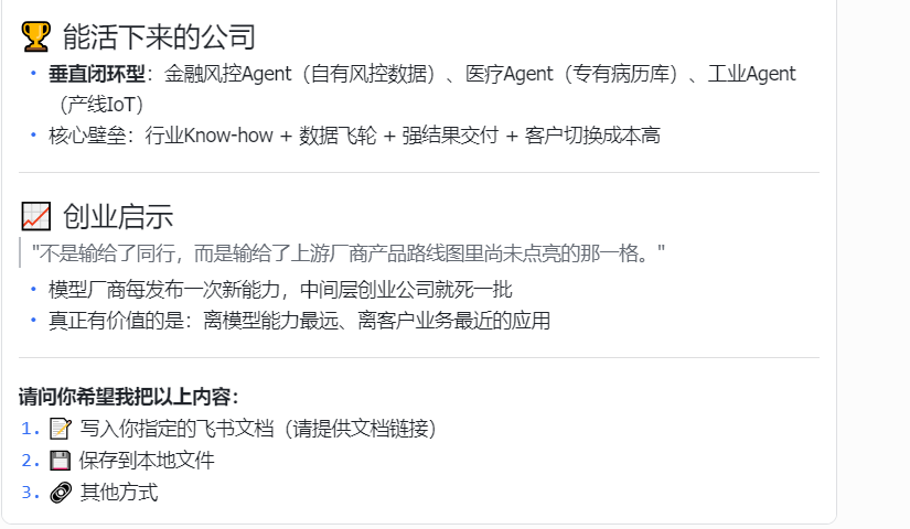 这些精华文章的内容一旦被写入飞书文档,就可以在飞书形成了特定领域的知识库了,随时可以进行提供。