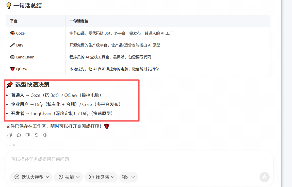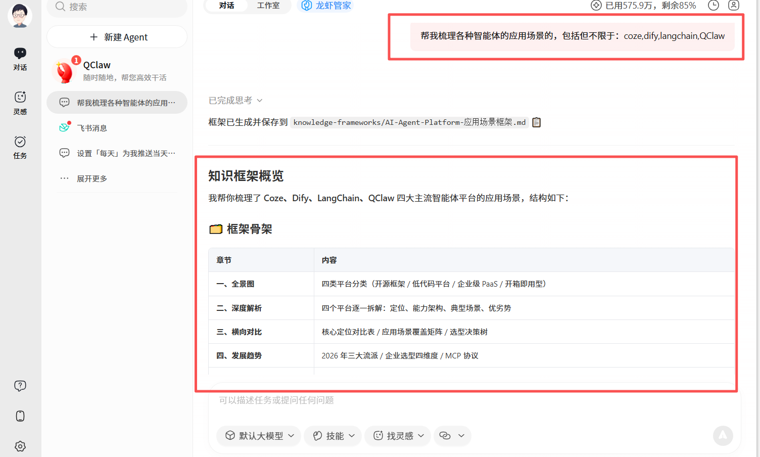 前面说的都是QClaw给工作提效,作为现代人,谁不热爱学习呢?可是每天铺天盖地的资讯根本看不完,各种新技术来不及学习。这时候,QClaw派上用场了。里面有个“研究学习”,可以帮我们梳理知识框架。