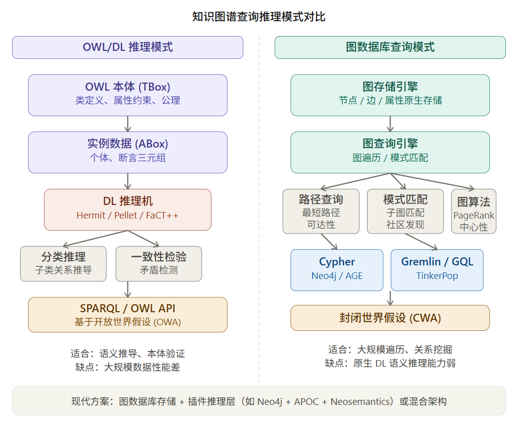 核心能力 | 语义蕴含、自动分类 | 路径遍历、模式匹配 |