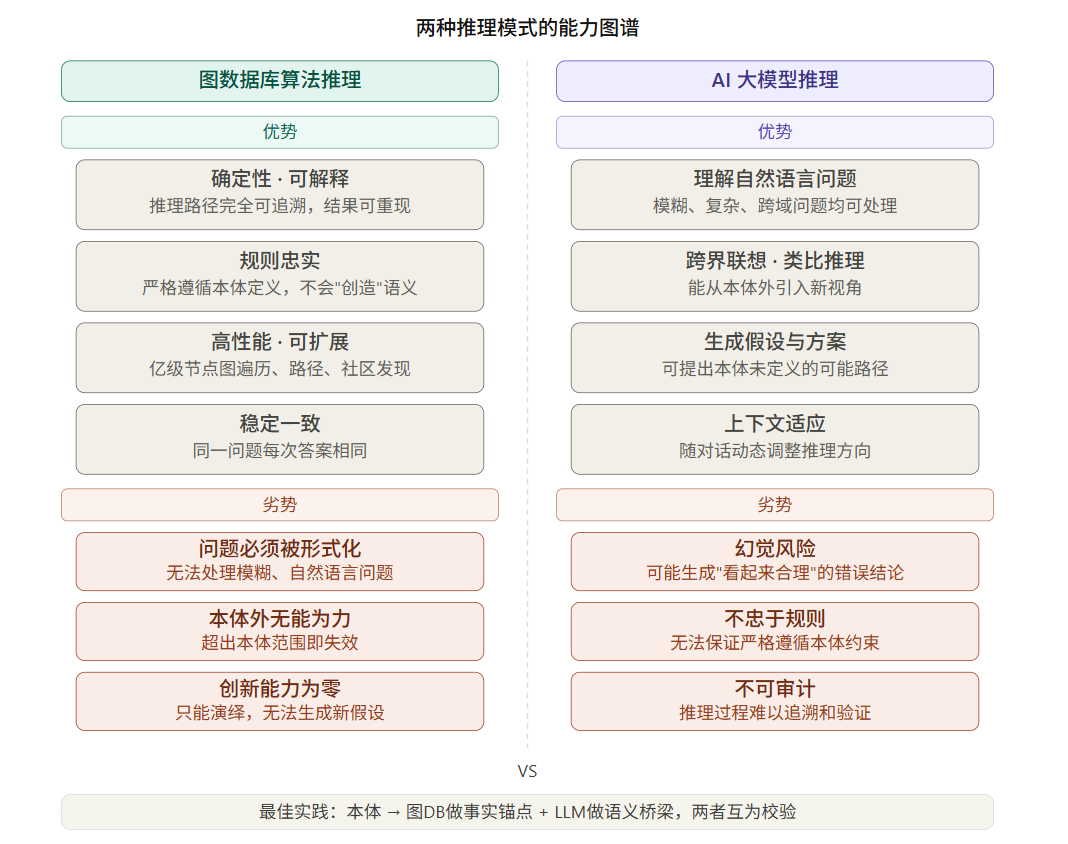 问题:我在前面聊本体论的时候有一个重要思考,就是我构建了完整的本体模型(对象+行为+规则),那么已经有了完整的业务语义,那么面对新的问题或场景的时候,我希望是通过AI大模型自己去分析推理,那么基于图数据库的算法推理和AI大模型自己去推理?两种模式各自的优缺点如何?