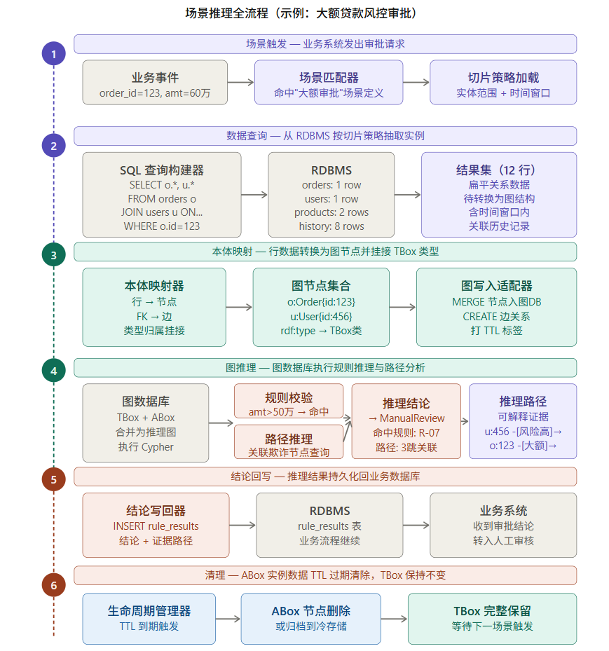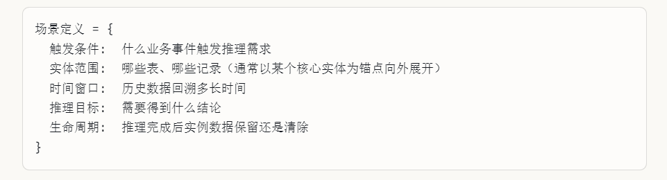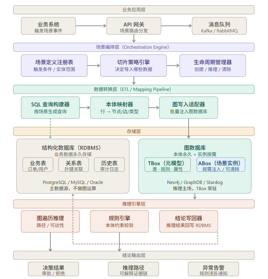 ① 场景定义注册表是整个架构的"神经中枢",它决定了切片策略,必须先于系统上线完成设计。每个场景至少需要定义:触发条件、锚点实体、关联跳数、时间窗口、推理目标、ABox 生命周期。