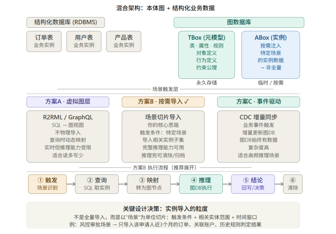 **方案B(按需导入)**是你设想的,也是最推荐的。核心优势是推理时图数据库拿到的是真实物化的子图,推理能力完全可用。关键不是"能不能做",而是"切片粒度怎么定"。