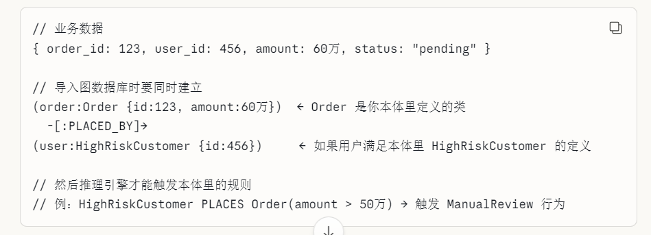 是的,你的判断完全正确。 本体模型(TBox)在图数据库里,但没有实例数据(ABox)接入时,图数据库的推理能力是"空转"的——就像有了完整的法律条文,但没有具体案件可以审判。