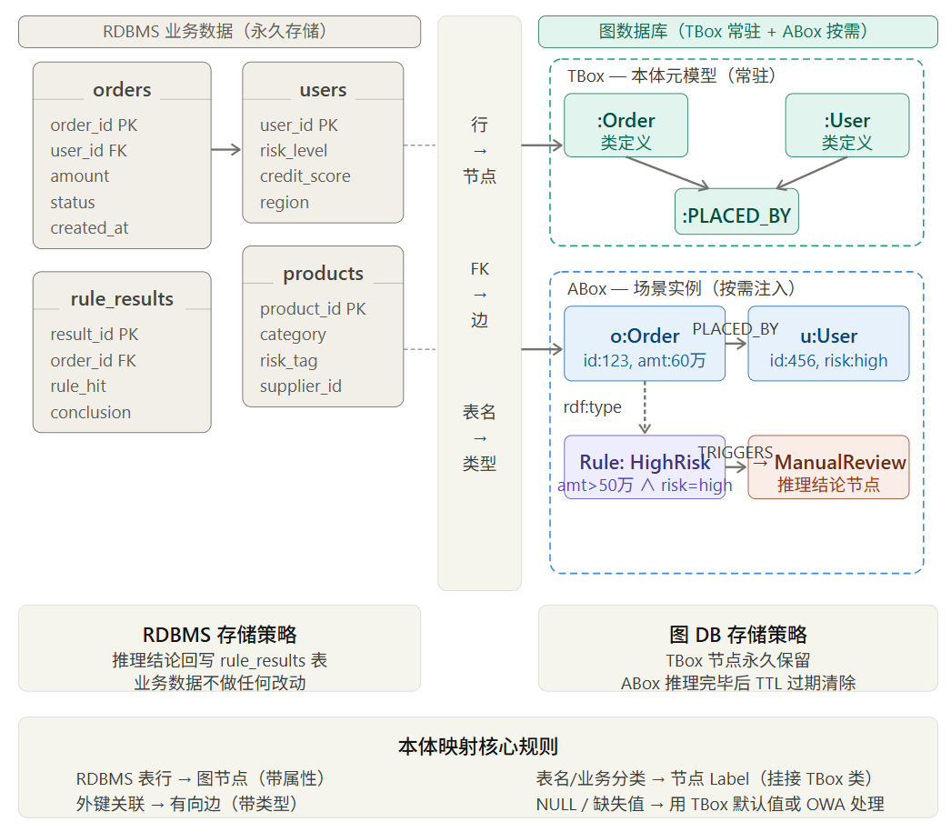 ② 本体映射器是最容易出错的环节,行数据转图节点时必须同时完成 rdf:type 挂接(实例→TBox 类),否则推理引擎看到的只是裸数据,规则触发不了。这一步的代码逻辑需要与本体模型强绑定维护。