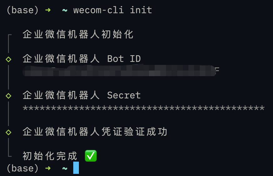 按提示输入你企业微信机器人的 Bot ID 和 Secret,凭证会加密存储到 ~/.config/wecom/bot.enc。