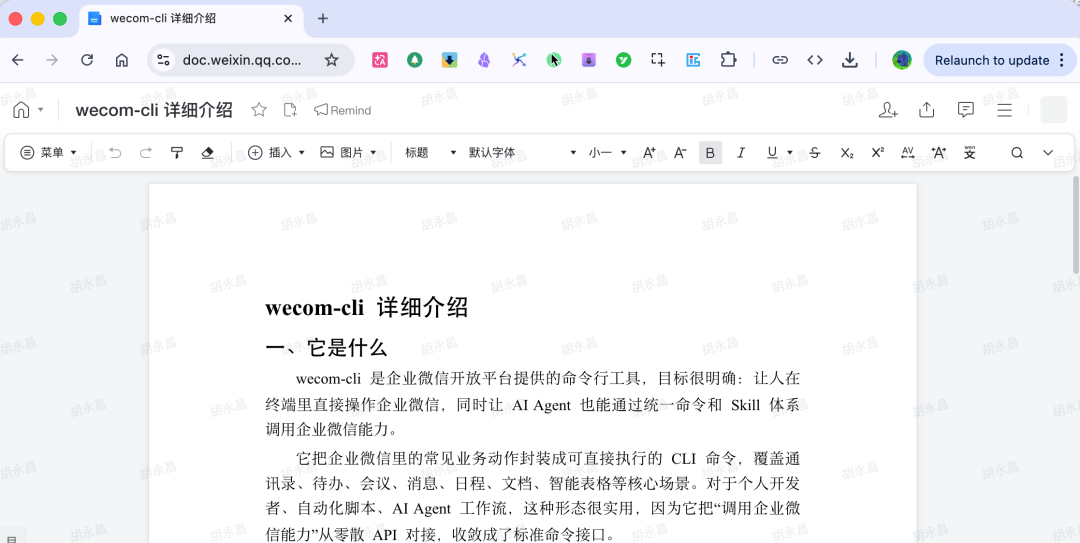 wecomcli-manage-doc | doc | 文档创建/读取/编辑 |