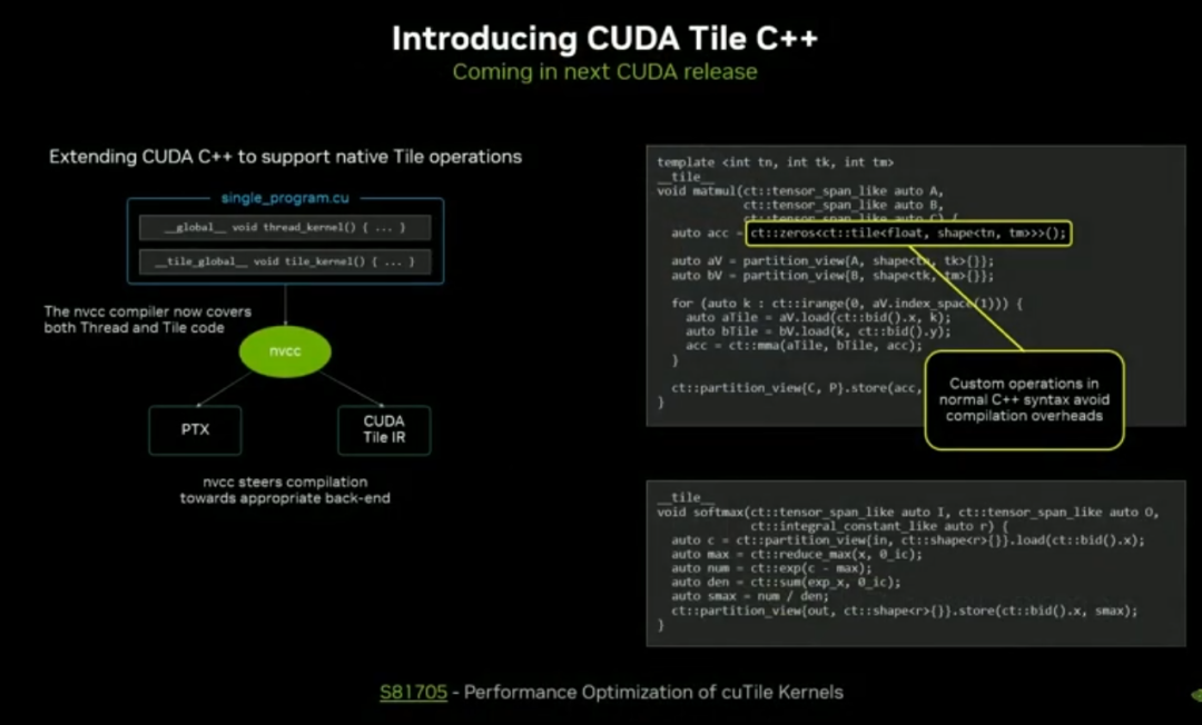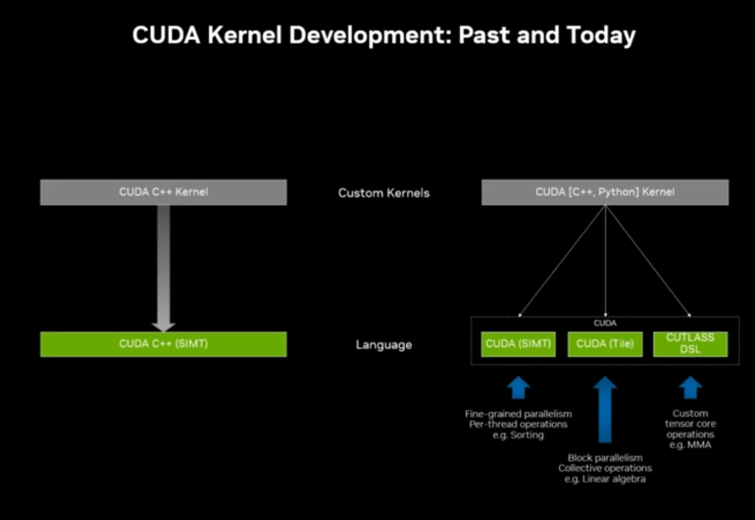 新增 Tile 级编译器 + CuTe(Tensor Core 编译器),恢复复杂张量代码的便携性