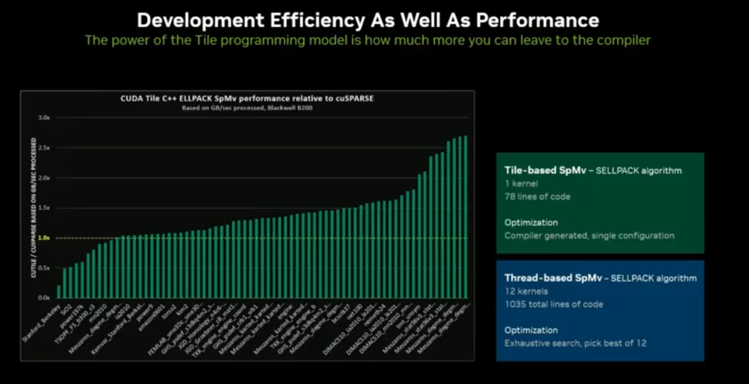 开发效率大幅提升:78 行 Tile 核函数可替代 12 个传统核函数(约 1000 行代码),稀疏矩阵场景性能超越专业库 KSPARSE。