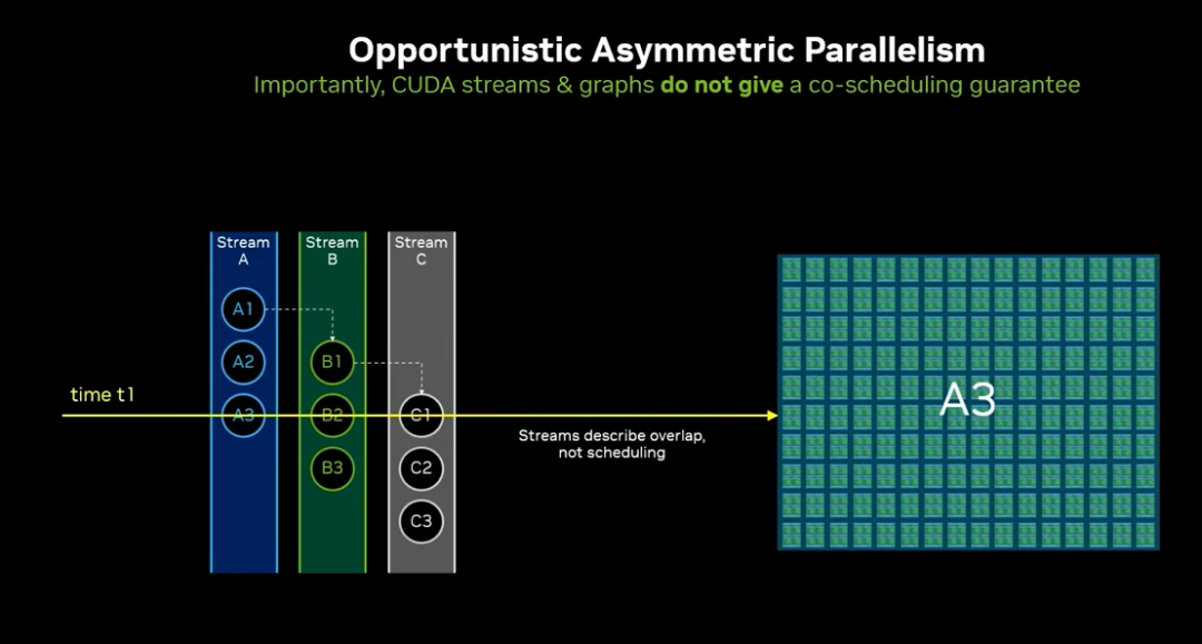 非对称并行:同一系统上同时运行多种不同任务,传统 CUDA Streams、任务图仅能实现机会主义并发,无法保证资源隔离与同时执行「4:15」。