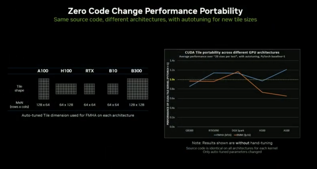 跨架构无码移植:同一代码可在 Ampere、Hopper、Blackwell、RTX 等架构运行,性能保留80%~90%。