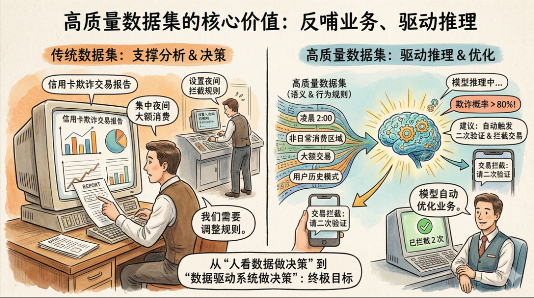 还是上面那个银行的例子。一个传统数据集可能会告诉你:“过去一个月,信用卡欺诈交易主要集中在夜间大额消费上。”然后,银行工作人员根据这个结论,去调整风控规则。