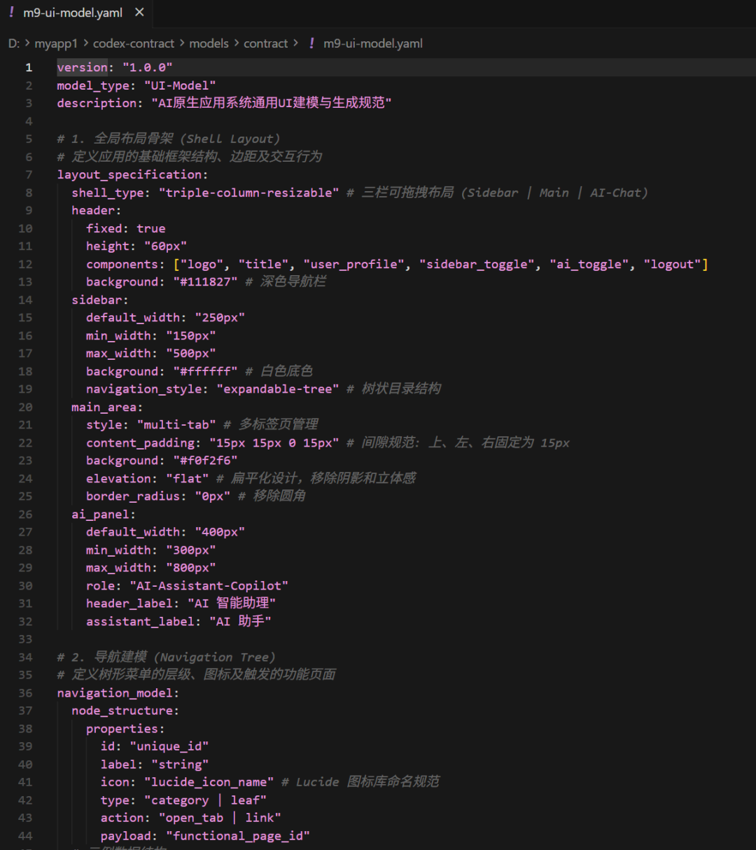 基于上面提示AI帮我输出了完整的可交互的界面原型。然后继续用AI逆向的思路,结合需求+Demo原型,让AI逆向输出一个UI建模标准规范的Yaml文件。