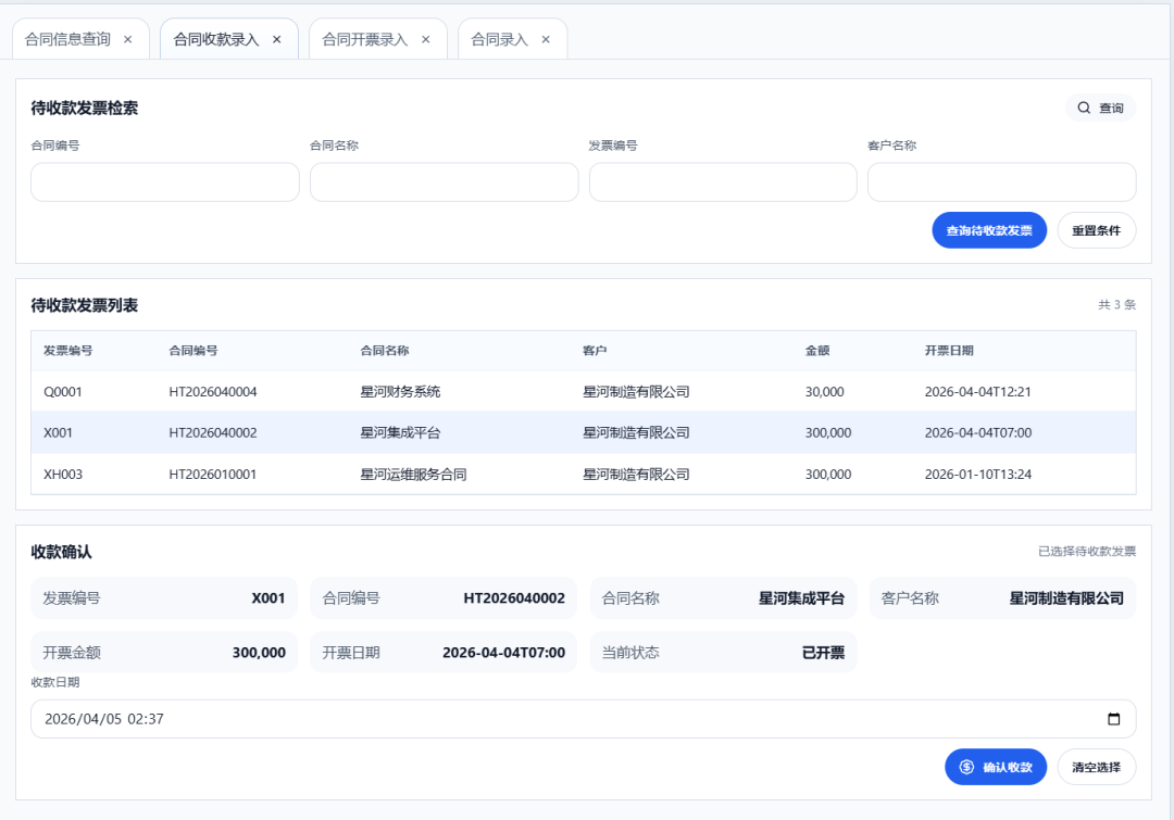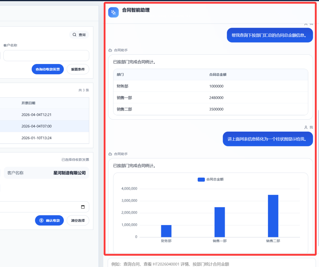 如果问题属于典型业务查询,例如“按部门统计合同总金额”“查询已开票未收款合同”“查看某合同详情”,通常会调用 `semantic_query`。该工具内部会把自然语言进一步解析为结构化语义计划,识别对象主体是合同、发票还是收款,识别用户意图是列表、统计、详情还是数量,并提取分组维度、指标、字段、过滤条件以及最终结果应以文本、表格还是图表呈现。之后系统据此生成 SQL 查询 SQLite 数据库,并将结果组织成统一结构,再根据用户请求决定返回自然语言、表格或 ECharts 图表。