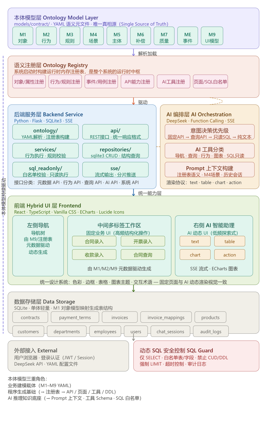 整个系统采用单体应用、分层解耦的方式实现,共六个层次,自上而下依次为:本体模型层、语义注册层、后端服务层、AI 编排层、前端 Hybrid UI 层、数据存储层。
