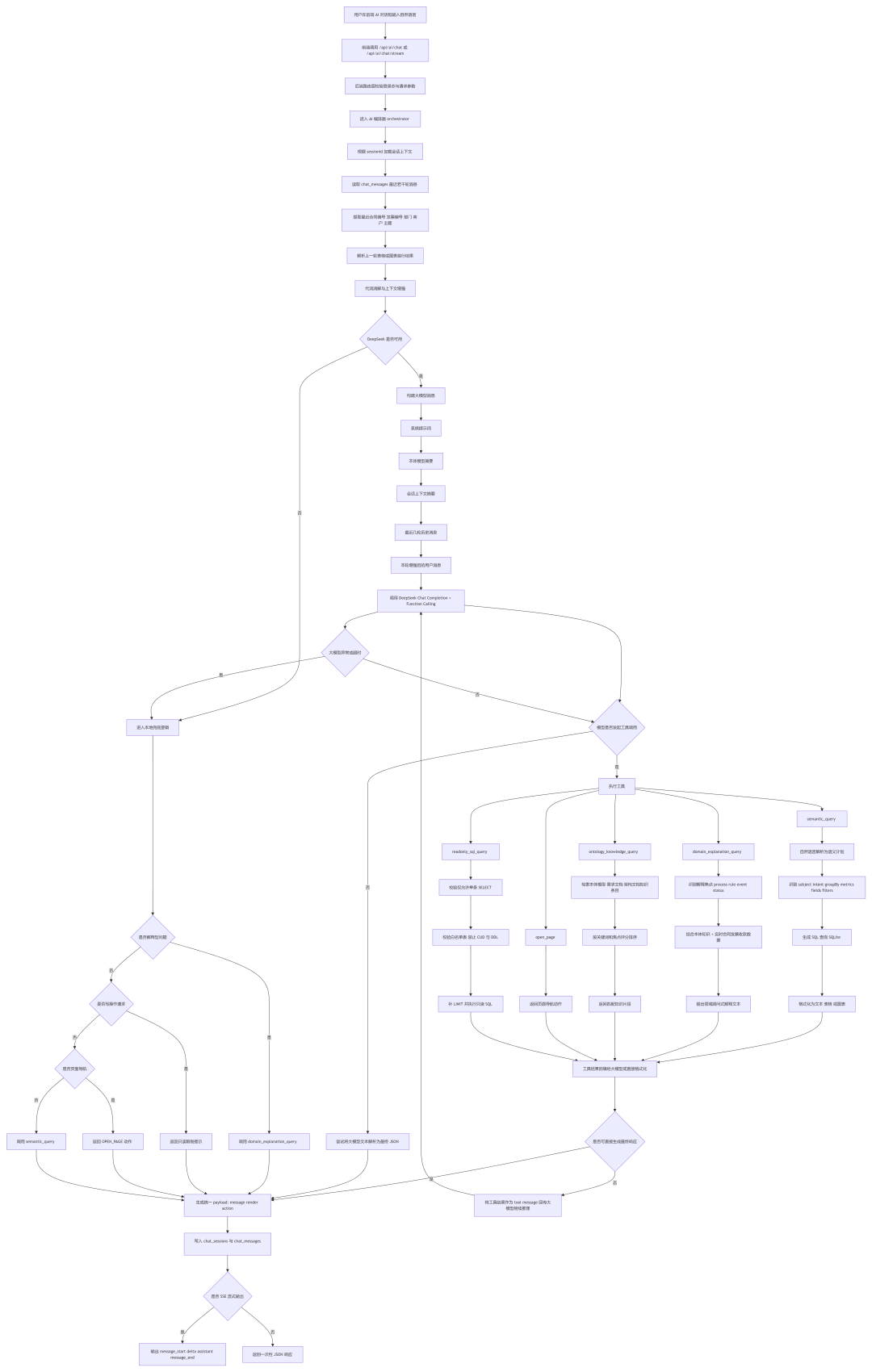 所以实际上我后续在调整AI智能对话和语义层能力上做了大量的迭代。我们来看下整个AI大模型处理我输入对话的完整逻辑: