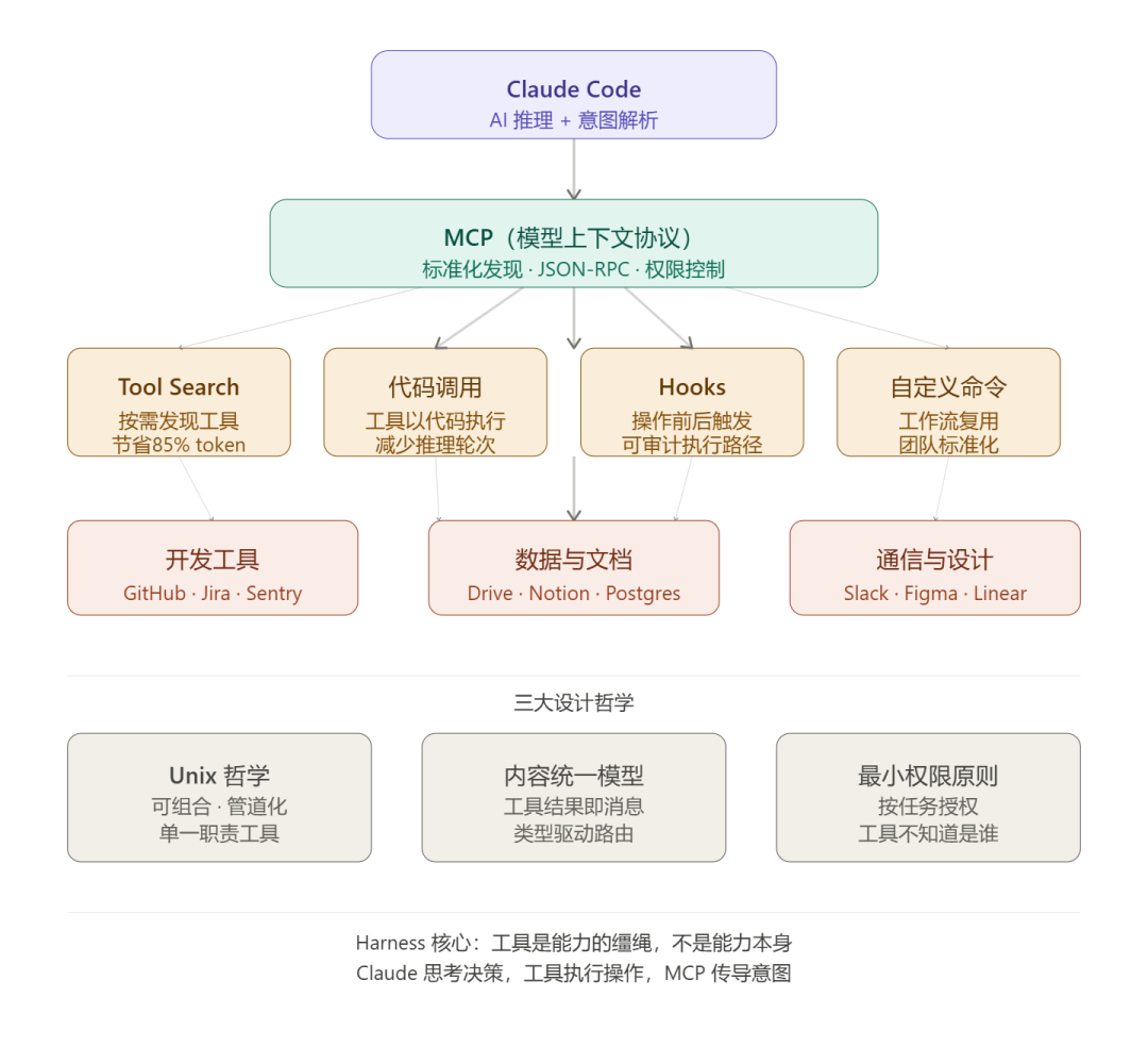 Harness 映射:工具是能力的缰绳,不是能力本身。Claude 思考决策,工具执行操作,MCP 传导意图——三者分工精确,职责不越界。