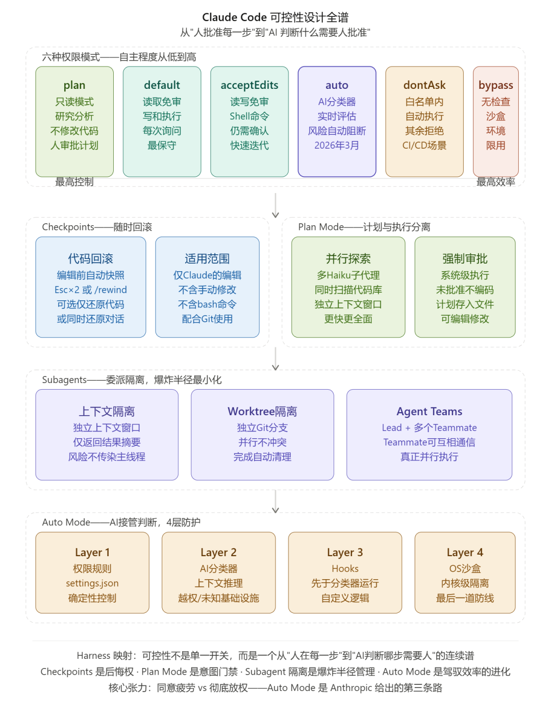 [架构图预留位置:Claude Code 可控性设计全谱图](含六种权限模式连续谱、Checkpoints 回滚机制、Plan Mode 意图门禁、Subagent 隔离、Auto Mode 四层防护)