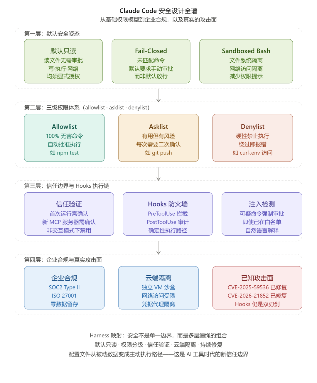 [架构图预留位置:Claude Code 安全设计四层全谱图](含默认安全姿态、三级权限体系、信任边界与 Hooks、企业合规与真实攻击面四层结构)
