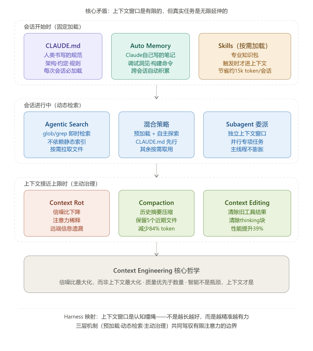 Harness 映射:上下文窗口是认知缰绳——不是越长越好,而是越精准越有力。三层机制共同驾驭有限注意力的边界。