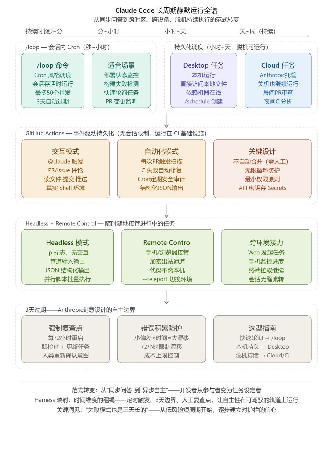 [架构图预留位置:Claude Code 长周期静默运行四层全谱图](含 /loop 会话内 Cron、Desktop/Cloud 持久化调度、GitHub Actions 事件驱动、Headless+Remote Control 四层结构,以及 3 天边界设计说明)
