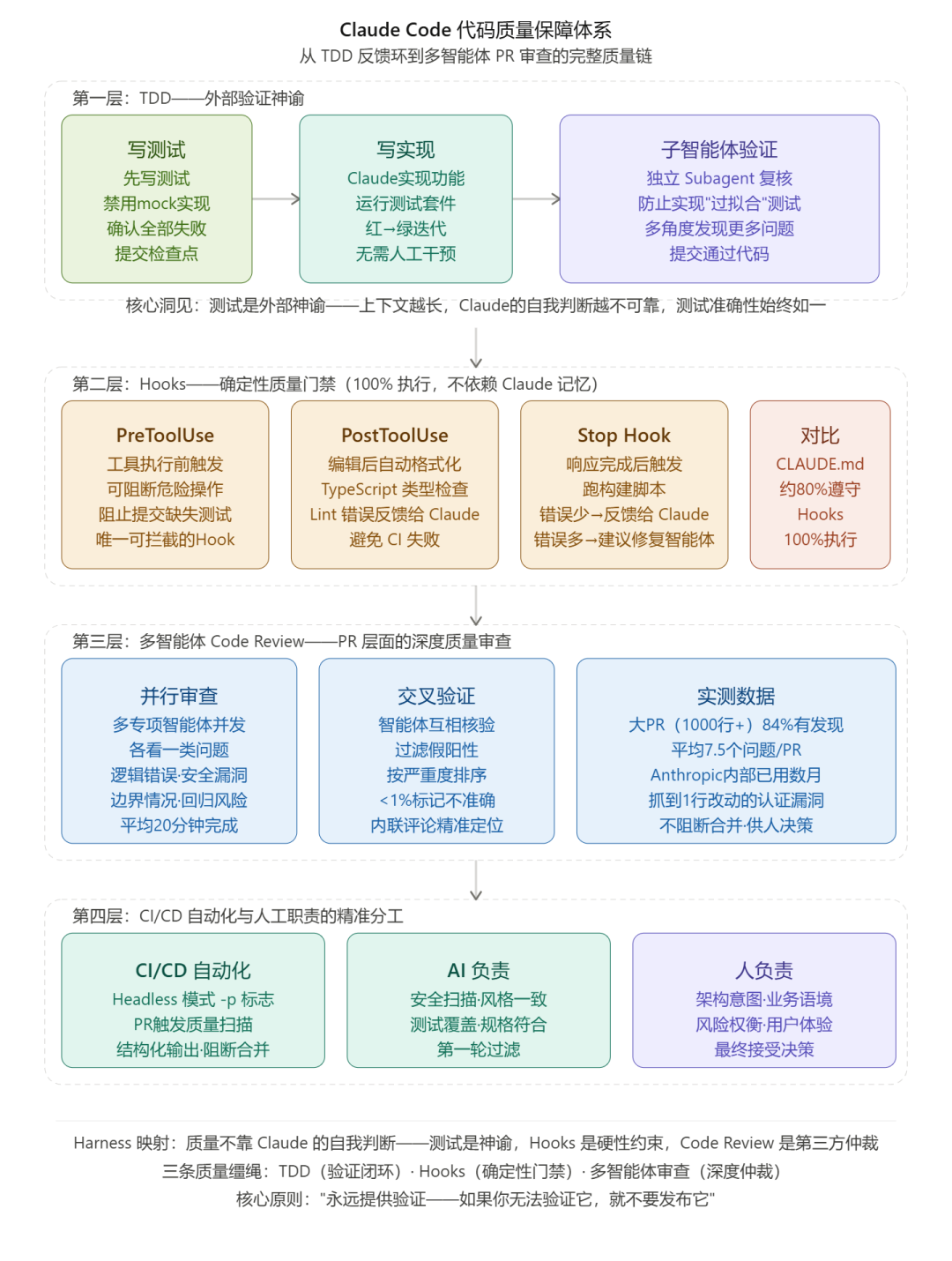 [架构图预留位置:Claude Code 代码质量保障体系三层架构图](含 TDD 外部验证神谕、Hooks 确定性质量门禁、多智能体 Code Review 三层结构)