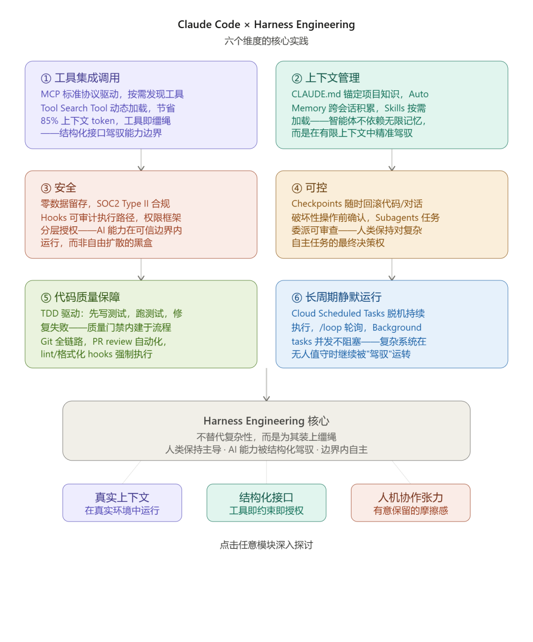请列出Claude Code实践了Harness Engineering的关键点。 我需要你从 1.工具集成调用 2. 上下文管理 3. 安全 4. 可控 5. 代码质量保障 6. 长周期静默运行等方面进行关键阐述。