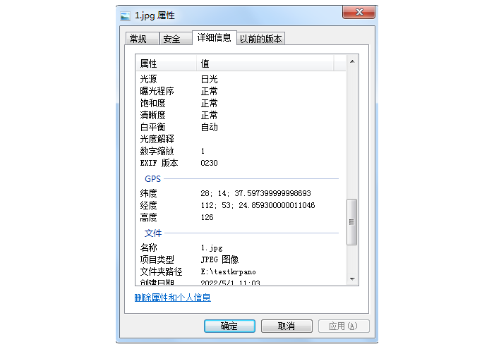 上图是一张带了坐标的JPG照片信息,在Windows中通过查看文件的详细信息,可以看到这张图片的Exif信息。