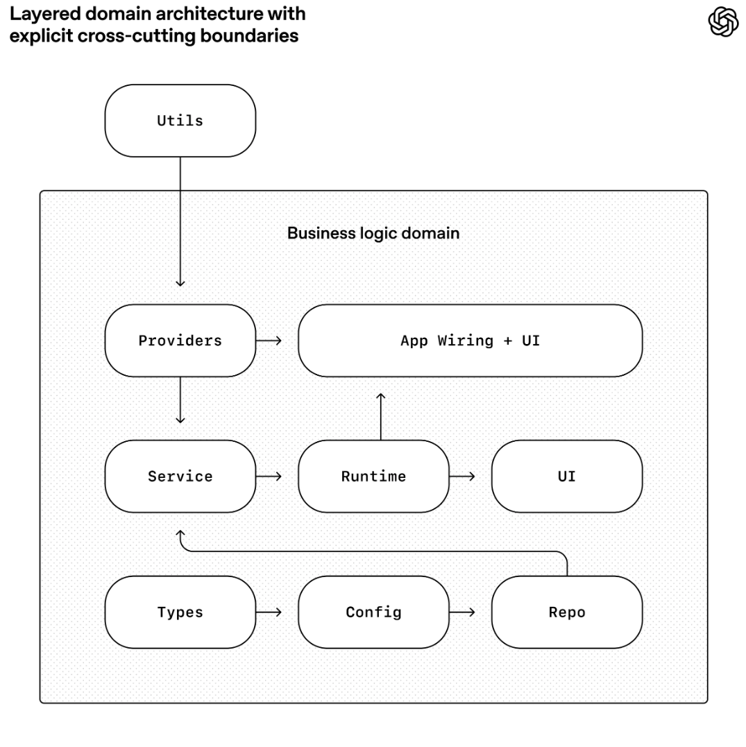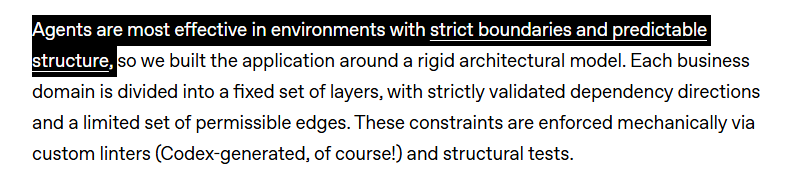 OpenAI 的《Harness engineering: leveraging Codex in an agent-first world》则把更深入的阐明框架约束的价值,agent在边界清晰、结构可预测的环境中效率最高,光有设计文档还不够,必须把架构边界和工程偏好编码成可机械执行的约束。[30] 他们把业务域切成固定层次,限制依赖方向和允许的跨层边,把这些规则写进 custom lints 和 structural tests;就连 structured logging、schema/type 命名、文件大小和平台可靠性要求,也都被做成了带 remediation 指令的 lint 规则,直接回注到 agent 上下文里。[30] 这和上面提到的架构设计约束里面也不谋而合:对于 coding agent,架构不是留给人类心领神会的“最佳实践”,而必须被做成 agent 可见、可判定、可持续执行的外部约束。