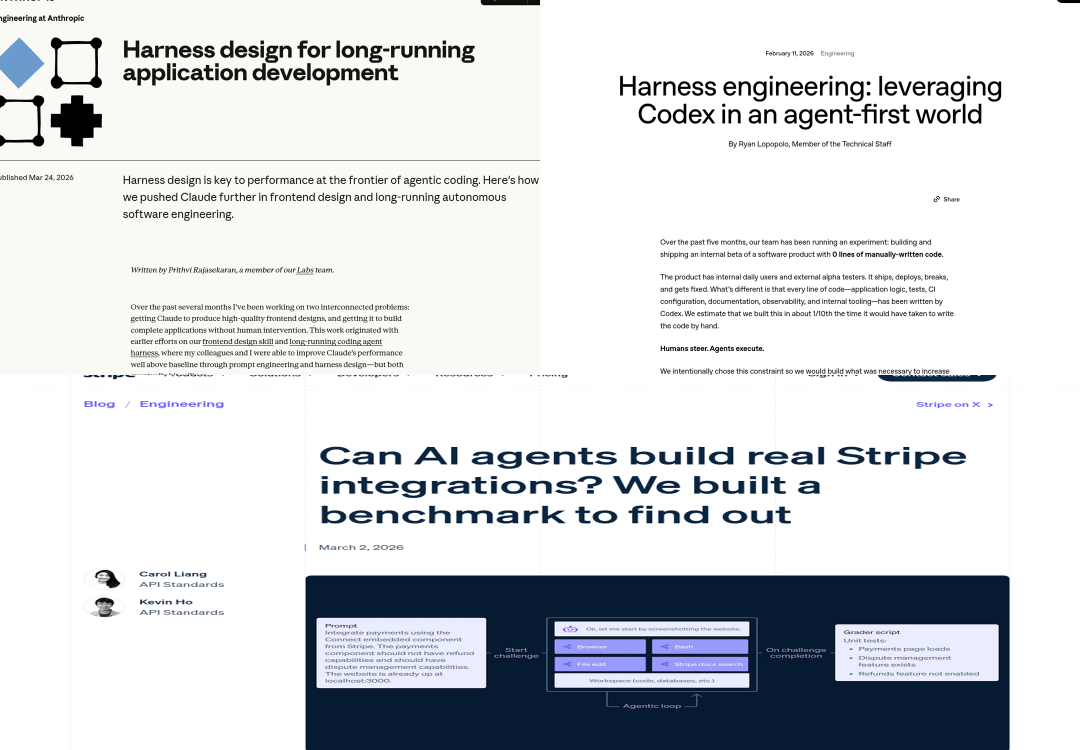 把这个项目的经验放到过去一年到现在的社区agent 实践里看,会发现它并不是一个孤例。随着模型能力提升,coding agent 被推向了更长链路、更复杂、也更接近真实工程的任务;与此同时,原本分散在上下文管理、工具设计、执行环境、handoff 和 eval 里的约束,也开始更频繁地被放到同一层面上讨论。尤其从 2025 年底到 2026 年,公开实践里关于 harness 的讨论明显升温。不同来源虽然语境不同,但讨论最后往往都会落到相近的一组工程约束上:长时运行自动化、执行环境、handoff、evals、边界与权威归属等侧重于保障agent稳定运行的工程化实施。