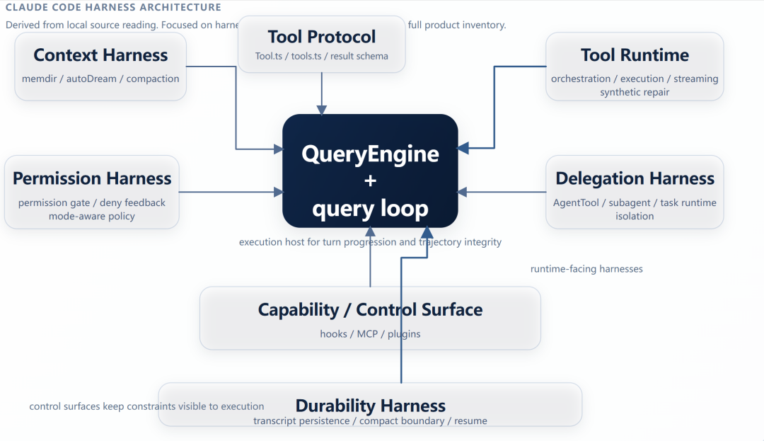 3 月 31 日的 Claude Code source map 暴露事件,把一个成熟工业级 coding agent 背后的部分工程实现突然暴露到了外部视野里。[40] 虽然这是由打包/发布失误引发的源码暴露事件,但对我们来说,也意外提供了一次学习 顶级agent如何在工程实践中使用harness的机会。结合对这批源码快照的初步拆解,可以看到几类关键 harness 机制同时在项目中进行了使用:上下文组织与压缩、权限门控、subagent 隔离,以及通过 hooks 等外部控制面把约束持续带回执行过程。也可以更加确信Claude Code的领先不只来自模型能力,也来自治理层与外部控制面的工程化harness的设计和实现。