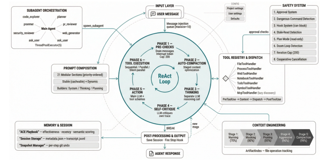 LangChain 在 2026 年3 月关于 agent harness 的文章里,则把 harness 直接定义为模型之外那整套让 agent 真正变得可用的代码、配置和执行逻辑。[33] 而 OPENDEV 这篇论文给出的也不是抽象定义,而是一组更具体的 harness 实践:工作负载特化的模型路由、规划与执行分离的双代理架构、自适应上下文压缩、跨会话记忆和事件驱动提醒,本质上都在回答同一个问题:如何围绕模型建立能够支撑长程软件工程任务的外部工作系统。[28]