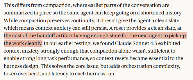 最容易意识到但实践又容易忘记的一个点:窗口并不是免费的。 很多人会下意识地把一个对话窗口当成可以不断追加任务的无限工作台,仿佛只要上下文还没装满,就应该继续往里塞更多问题;但复杂工程任务并不是这样推进的。人做复杂工作时,不会指望在几个小时里同时解决所有相互牵连的问题,而是会把任务拆成难度适宜、边界清楚的阶段,一天只啃下当天能真正收口的一块。agent 其实也类似。一个窗口里同时堆入过多目标、过多未决判断和过多历史岔路,效果往往不是“连续推进”,而是把局部问题、旧结论和临时路径一起压成新的上下文噪音。即使 coding agent 会自动做 compaction,这也不等于窗口可以无限续命;在复杂任务里,多轮 compaction 往往会把细粒度约束、局部边界和未收口分歧不断压平,系统表面上还在延续,实际判断质量却会逐步变钝。因此更有效的方法,是让一个窗口只承载一件已经拆好的阶段性任务:做完就总结,留下显式痕迹,写入记忆或 handoff artifact,再在新窗口继续下一段。表面看这像是在增加切换成本,实质上却是在用阶段边界换取判断质量、用外部工件换取长期连续性。这既是一种更符合人类处理复杂问题的工作方法,也正是 harness 思想在日常工程里的具体体现。