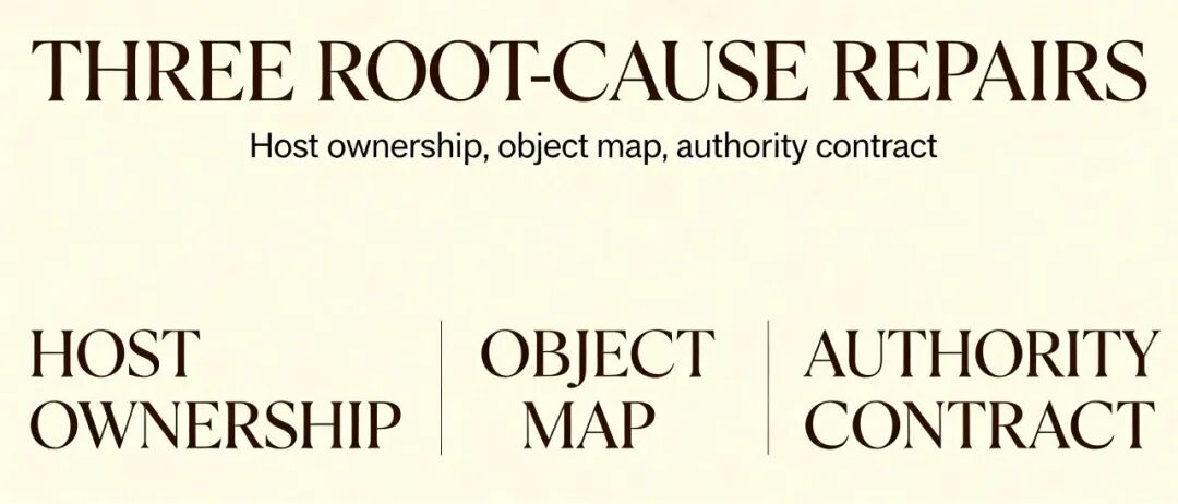 这一轮之后,三次根因修复连起来才形成了一个更完整的判断:最开始看上去只是表层症状的问题,真正往下追,会先落到宿主归属与职责边界,再落到语义归属与权威对象,最后落到后端 authority contract。走到这里,重构的焦点也已经从局部实现本身,转到了系统如何定义真值、发布边界和推进状态。