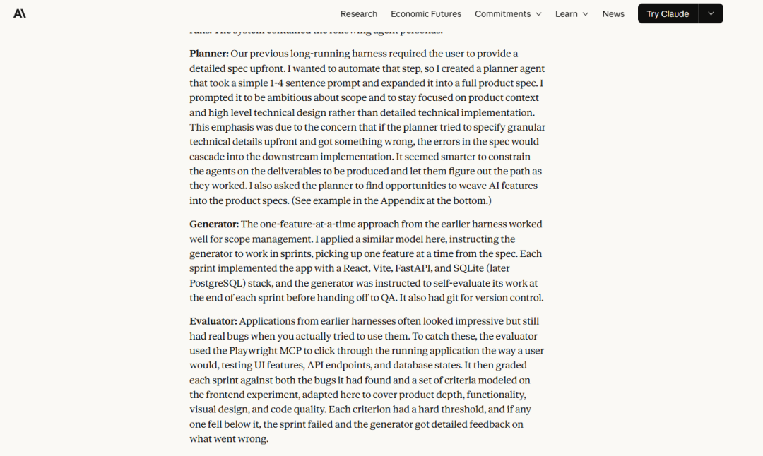 Anthropic 关于 long-running harness 和 evals 的几篇文章,直接回答了“为什么不应停留在 prompt engineering”这个问题。《Effective harnesses for long-running agents》非常明确地指出:仅有 compaction 不足以支撑长程软件工程任务,真正有效的办法是为 agent 准备清晰的环境工件、增量进展机制和 clean-state discipline。[3] 而 Anthropic 在 2026 年 3 月 24 日发布的工程文章《Harness design for long-running application development》又把这个判断向前推了一步:它明确区分了 compaction 和 context reset + structured handoff,指出后者能给 agent 一个真正的 clean slate;同时把 self-evaluation 失真、独立 evaluator、以及 planner / generator / evaluator 三角色和 sprint contract 这种阶段协商机制,一并纳入 harness 设计本身。[27]
