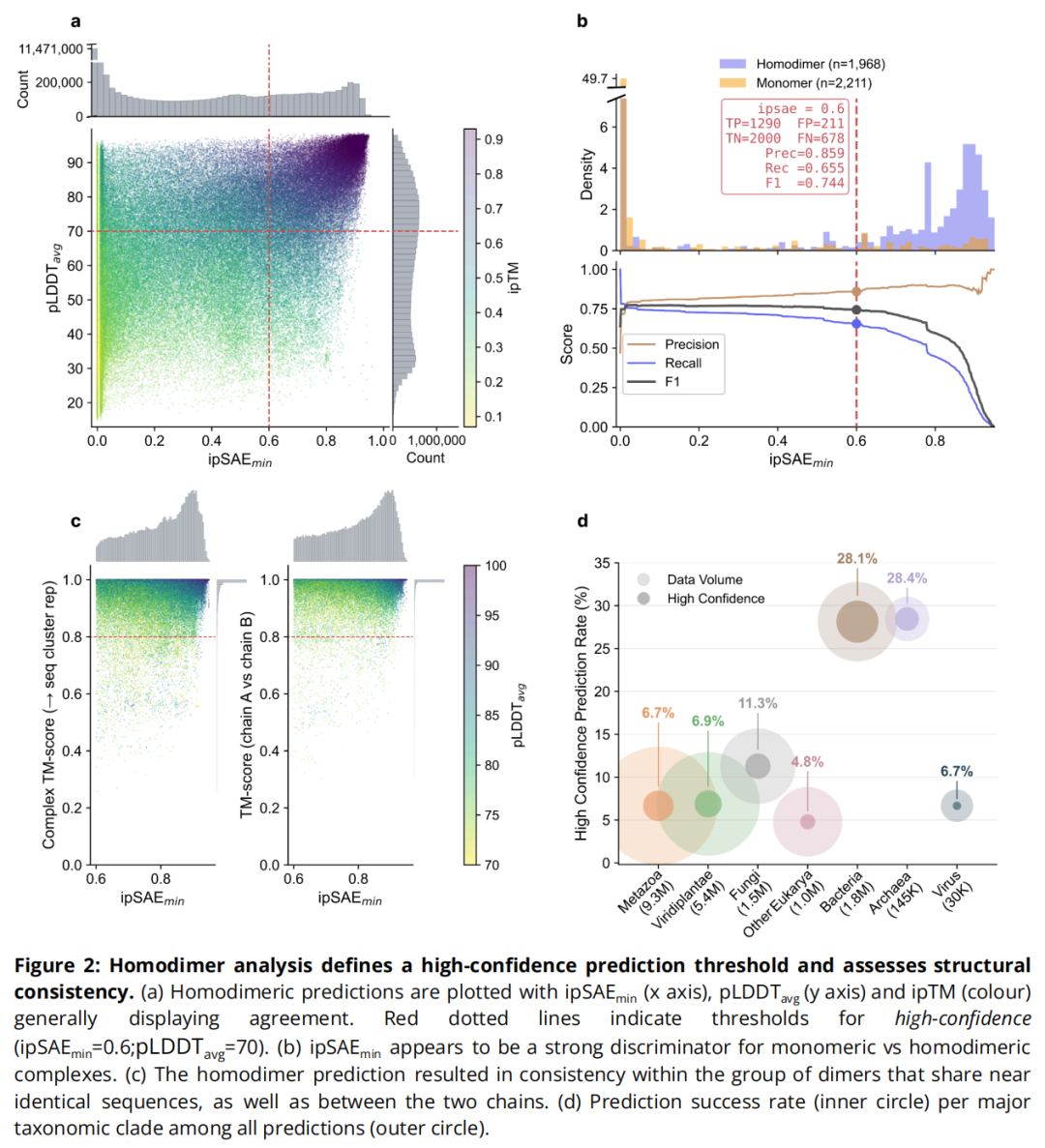 用 Foldseek 对每个预测同源二聚体的 A、B 两链进行结构对齐:98.81% 的预测达到 TM-score > 0.8,进一步确认预测结果可靠。