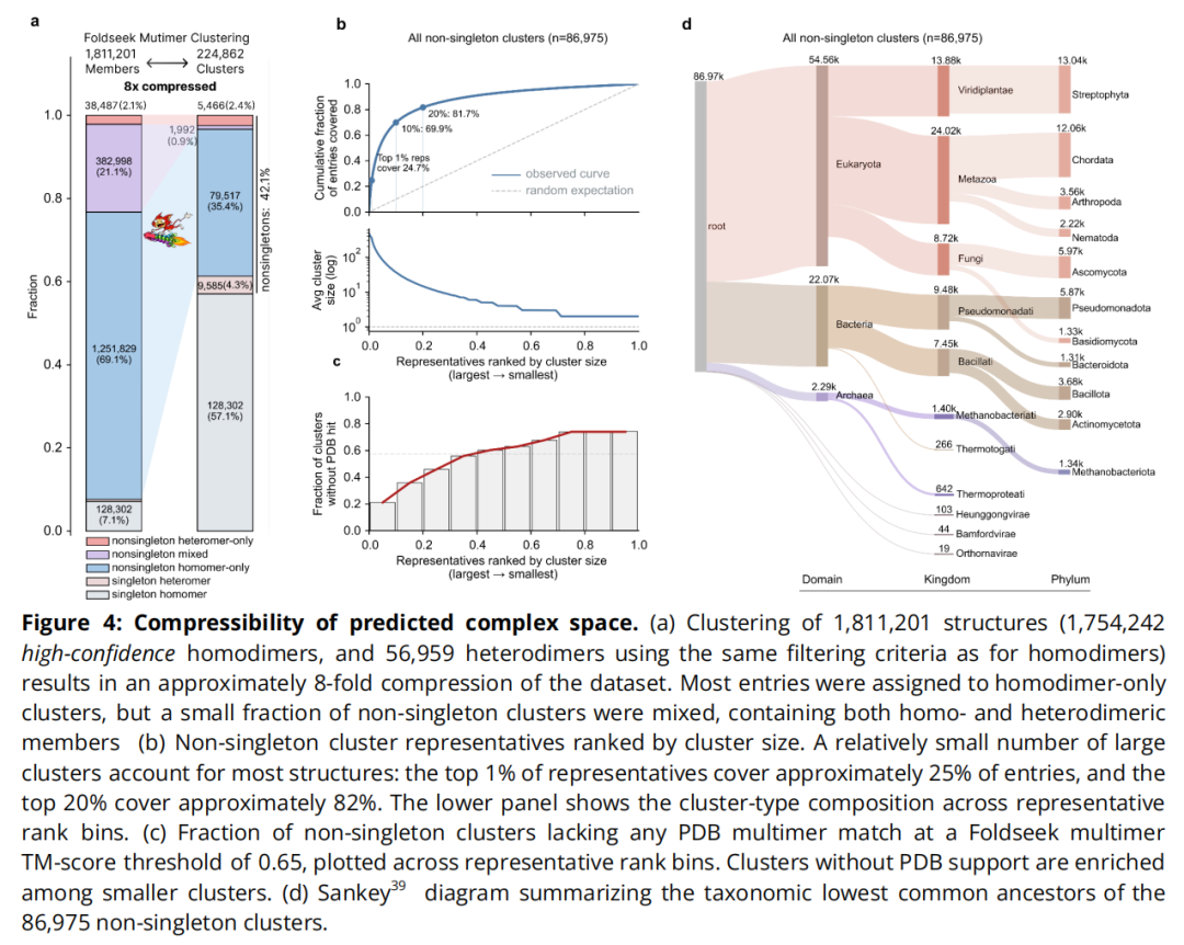 使用 Foldseek Multimercluster 对 1,811,201 个结构(1,754,242 同源 + 56,959 异源)进行聚类,参数: