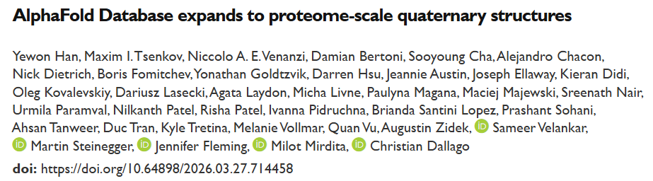 文献来源: Han Y, Tsenkov MI, Venanzi NAE, et al. AlphaFold Database expands to proteome-scale quaternary structures. bioRxiv (2026). https://doi.org/10.64898/2026.03.27.714458 预印本发布时间: 2026年3月29日 通讯作者: Sameer Velankar(EMBL-EBI)、Martin Steinegger(首尔国立大学)、Jennifer Fleming(EMBL-EBI)、Milot Mirdita(成均馆大学)、Christian Dallago(NVIDIA)