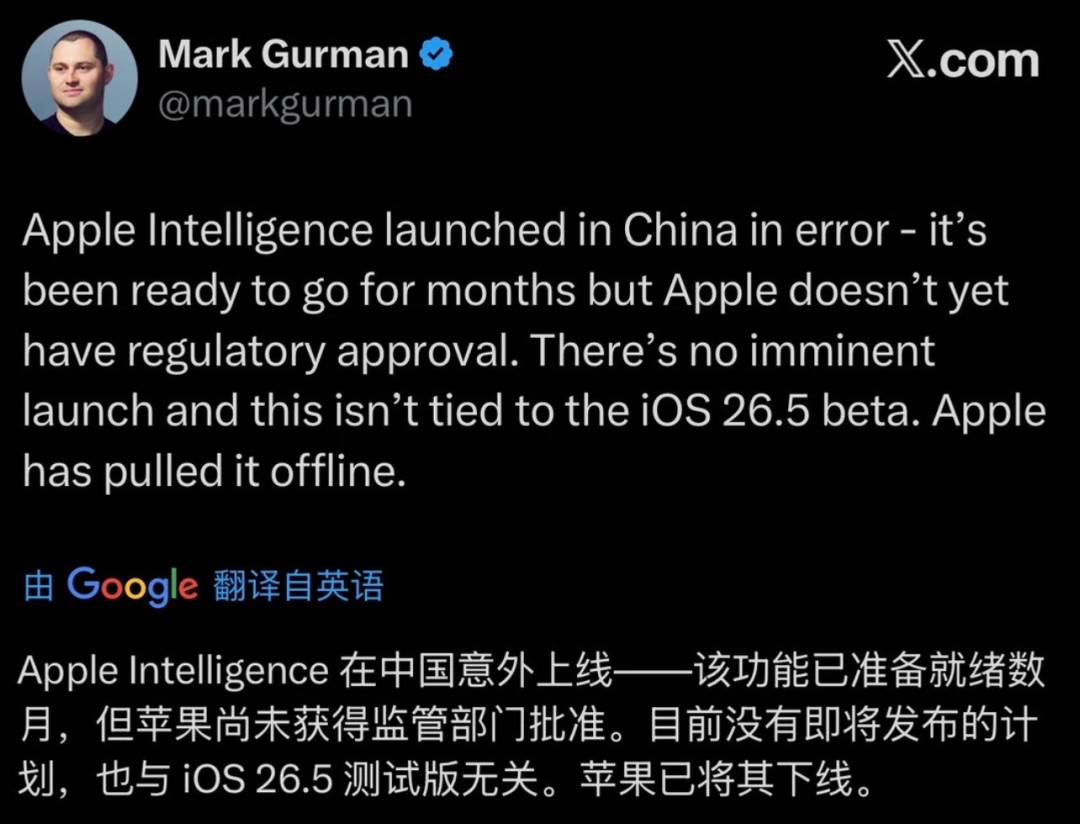 而且此前已有博主透露,苹果早已开启国行版灰度测试,只是未获得监管批准,这次突发上线,更像是测试过程中的一次意外泄露。