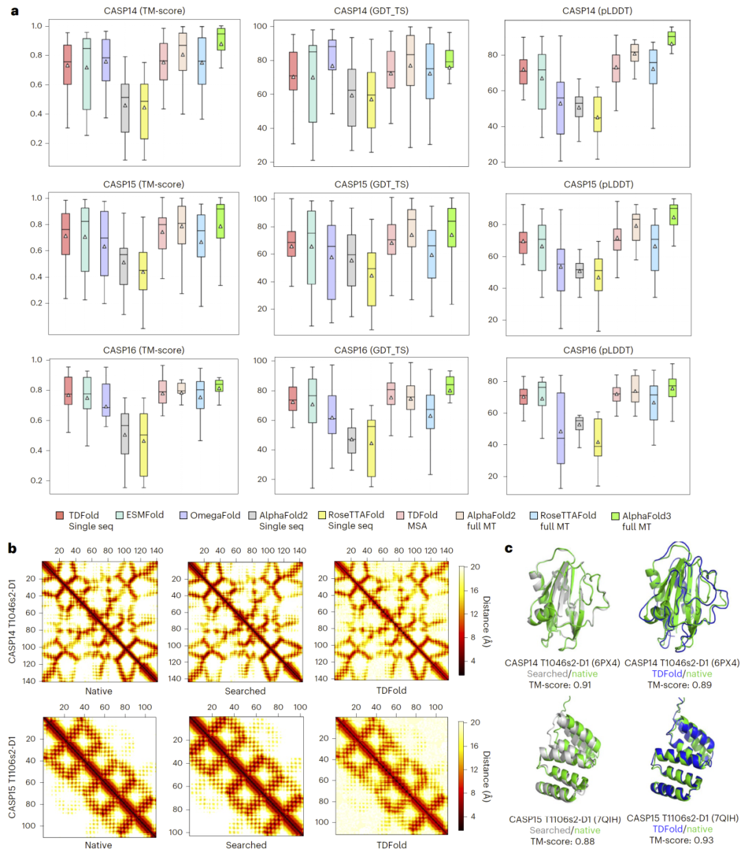 在CASP14、CASP15和CASP16等标准基准测试中,TDFold表现出与现有主流方法相当甚至更优的性能。与仅依赖序列的模型相比,TDFold consistently取得更高的TM-score;与依赖同源信息的方法相比,在单序列模式下优势更加明显。