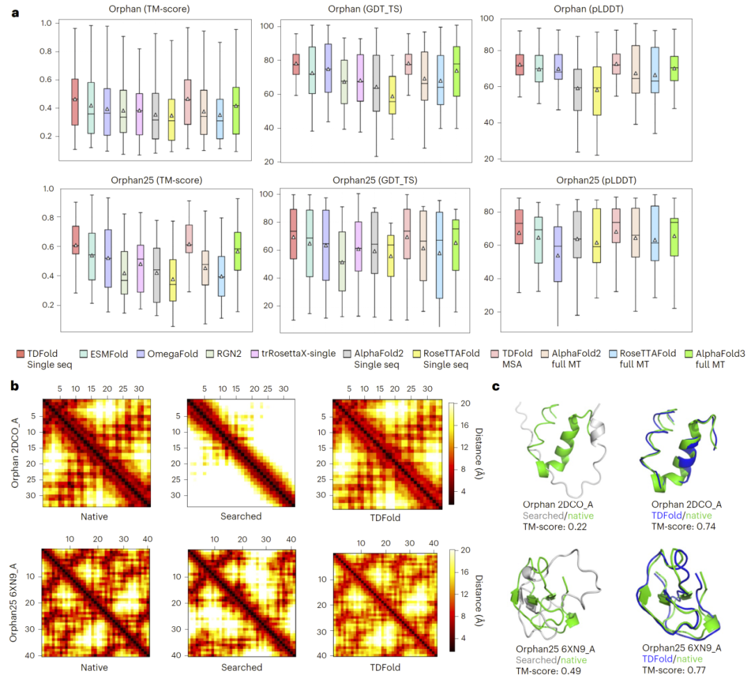 在缺乏同源信息的Orphan和Orphan25数据集上,TDFold显著优于AlphaFold、RoseTTAFold以及多种蛋白语言模型方法。研究人员发现,即使在完全无MSA信息的情况下,TDFold仍能取得最高的TM-score和GDT_TS表现,表明其能够有效从单序列中提取结构信息。