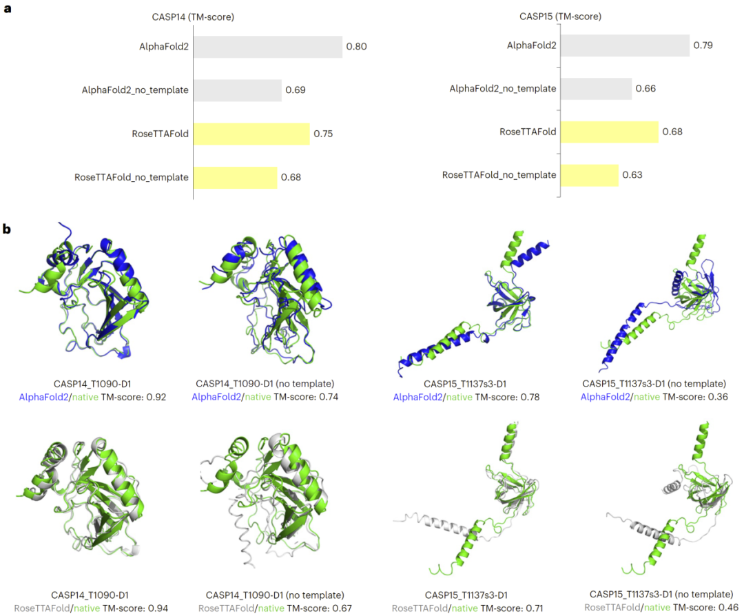 图1: 三维结构模板信息对AlphaFold2和RoseTTAFold在CASP14(N = 32)与CASP15(N = 45)数据集上预测性能的影响。