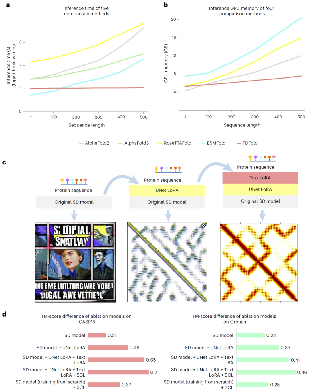 研究人员对比了多种方法的推理时间与GPU内存消耗。结果显示,TDFold在预测一个500残基蛋白时仅需约10秒,显著快于ESMFold(约100秒)以及AlphaFold系列方法(数百至上千秒)。同时,其内存占用明显更低,仅约7GB。