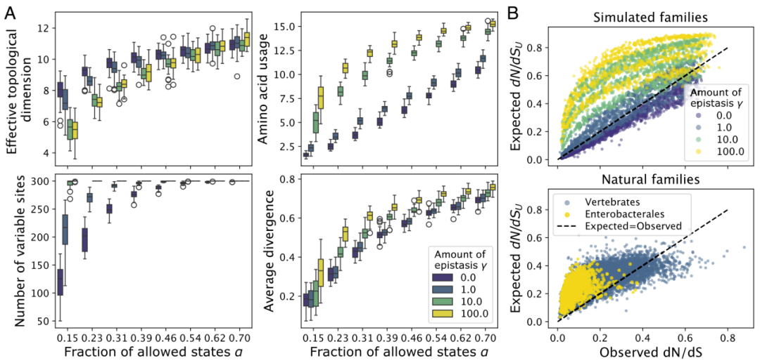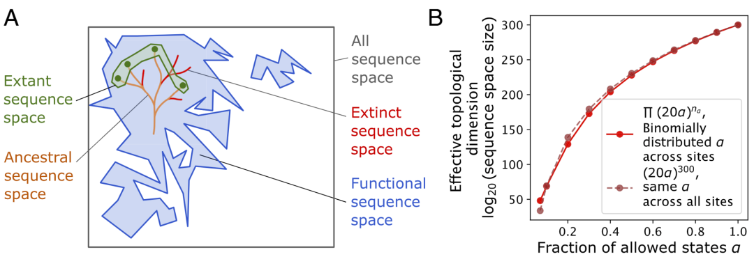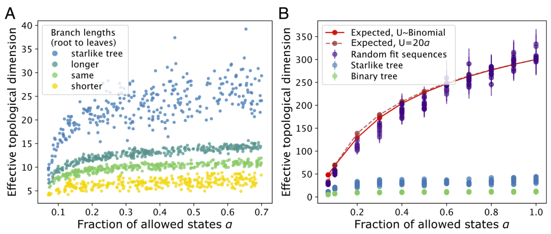 与之对比,如果从整个空间中随机采样序列,则可以达到理论最大维度。这一结果明确表明,自然进化路径本身限制了可达序列空间。