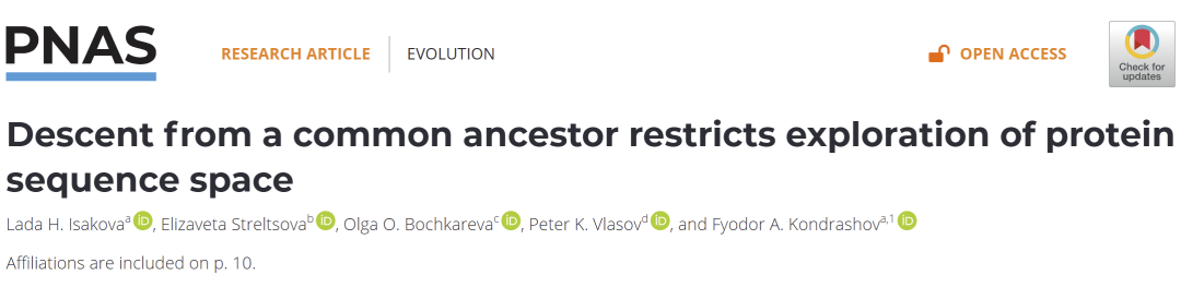 L.H. Isakova,E. Streltsova,O.O. Bochkareva,P.K. Vlasov, & F.A. Kondrashov, Descent from a common ancestor restricts exploration of protein sequence space, Proc. Natl. Acad. Sci. U.S.A. 123 (14) e2532018123, https://doi.org/10.1073/pnas.2532018123 (2026).