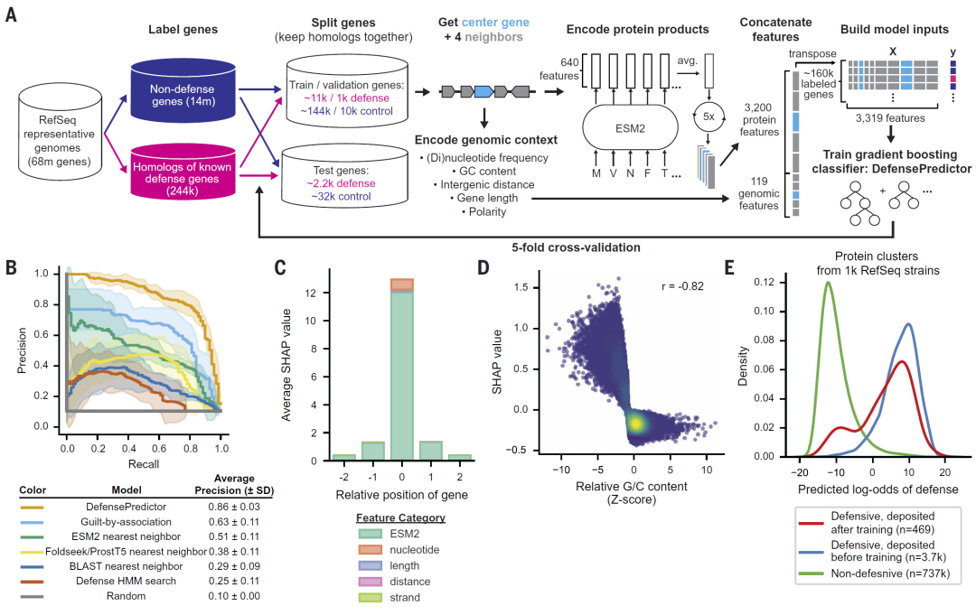 基于这些特征,研究人员训练了一个梯度提升模型,用于区分防御基因与非防御基因,并通过交叉验证评估模型性能。
