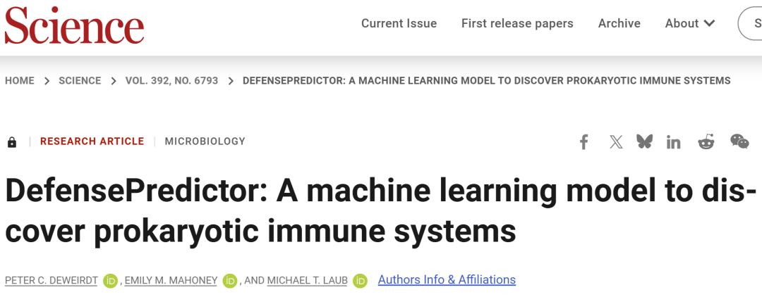 Peter C. DeWeirdt et al. ,DefensePredictor: A machine learning model to discover prokaryotic immune systems.Science392,eadv7924(2026).