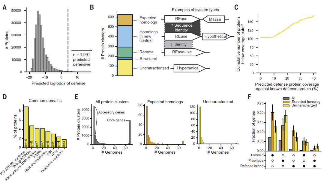 当模型应用于更大规模的原核基因组数据时,研究人员识别出数千个潜在防御蛋白簇,其中大量不属于已知类别。这一结果表明,原核免疫系统的多样性远超当前认知。