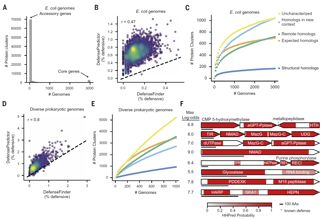 研究人员将模型应用于69株具有代表性的大肠杆菌菌株,识别出数百个潜在防御蛋白簇。其中相当一部分不属于已知防御系统,甚至完全缺乏同源性,显示出极高的新颖性。