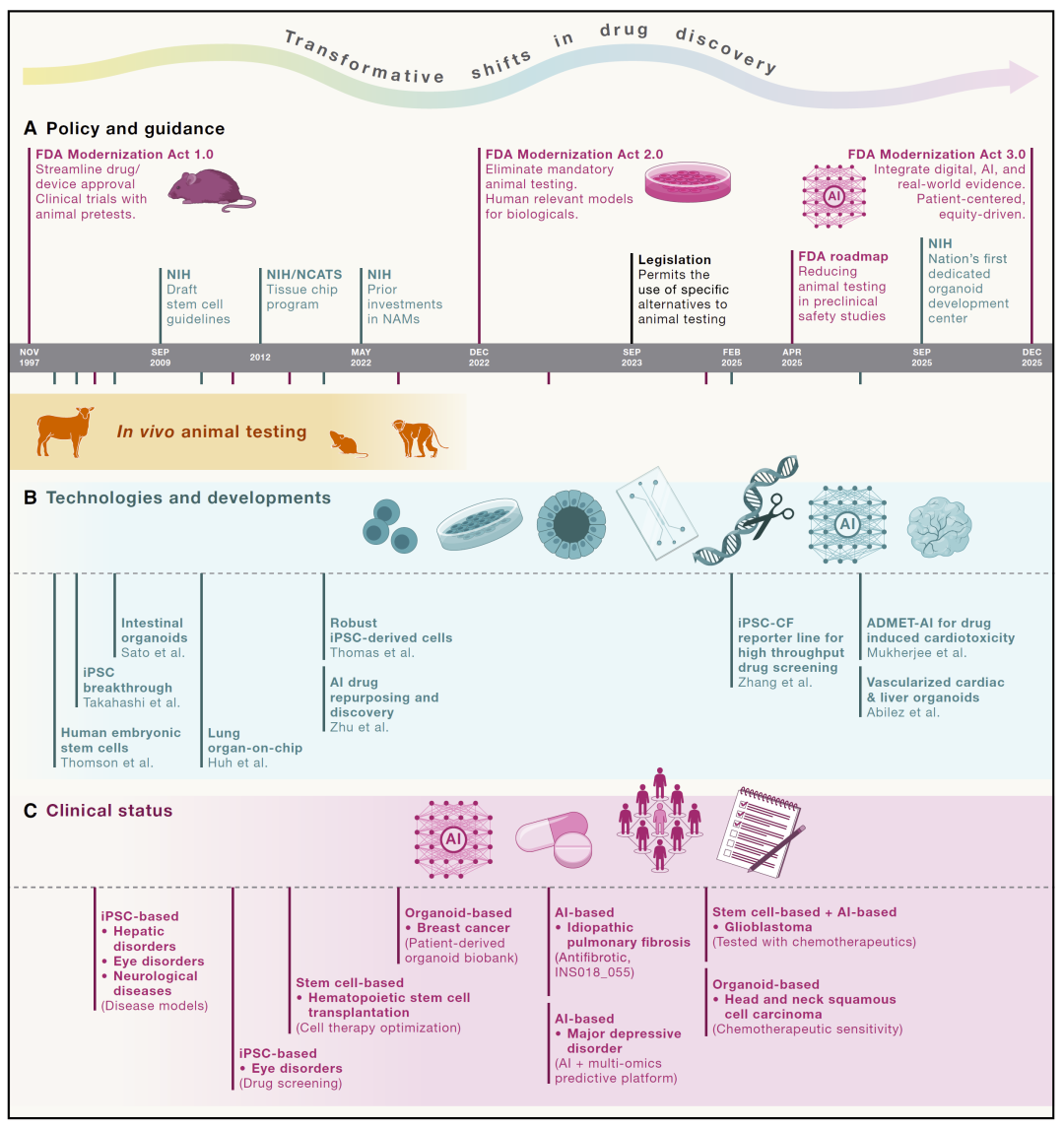 传统以动物模型为核心的药物研发体系长期面临极高的失败率,这促使研究人员不断探索更加以人为中心的新方法学(NAMs)。近年来,基于干细胞、类器官以及计算模型的技术迅速发展,并在监管政策的推动下,逐渐覆盖从疾病建模、药物设计到疗效评估的整个药物发现流程。